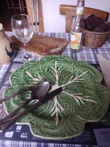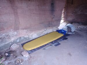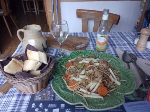 Danach ging es auf Essenssuche….ein Restaurant war zu verkaufen und geschlossen….ich hatte gestern schon festgestellt, dass es mit dem Essen nicht so einfach hier ist …entweder geschlossen oder zu früh oder zu spät da gewesen…ich überlegte…auf der anderen Seite gab es eine Herberge mit Restaurant…das hatte aber nur am Wochenende auf… ziemlich frustriert überlegte ich mit Hunger weiter zu laufen oder ob es noch eine andere Möglichkeit gab…dann entschloss ich mich in die Herberge zu gehen und zu fragen…. vielleicht gibt es wenigstens ein belegtes Baguette zum Mitnehmen….und die freundliche Frau sprach deutsch…im Ort hat wohl die Gastronomie aktuell geschlossen…sie stellte mir etwas zum Mitnehmen in Aussicht und sprach die Köchin an…die bot mir gleich Spaghetti Bolognese an, die sie für die Familie gekocht hatte …ich freute mich riesig und nahm das Angebot dankend an 🤓… ziemlich satt machte ich mich auf den Weg und traf noch das Paar mit dem ich gestern in der Hütte übernachtete…kurzer Plausch, dann zog ich schon Mal los…. Tagesziel eine Burgruine und mögliche Schlafstelle…. zeitweilig regnete es….nun liege ich hier gehen 17h schon in der Burgruine in meinem Nachtlager und es regnet… glücklicherweise habe ich zumindest ein Dach über dem Kopf….löchrig zu den Seiten hin ist es schon….aber nass werden ich wohl nicht werden…