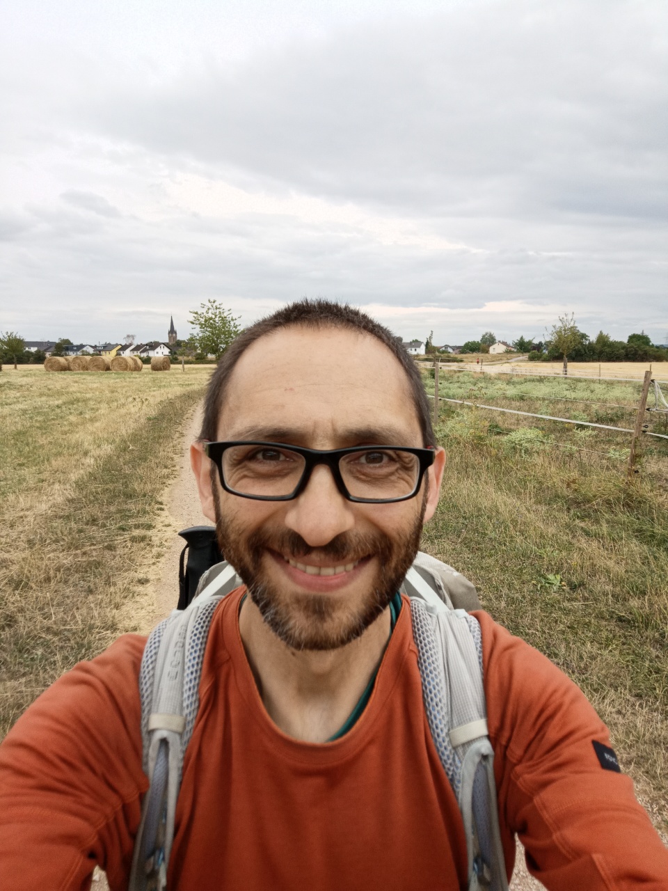 …habe gerade den Anfangsbild daneben aufgemacht – dein Haar ist länger, Heurollen sind da, Wolken sind da, Kirche befindet sich irgendwie auf der anderen Seite von dir…hähh? Aber Shirt und Rucksack sind die gleichen, über dich (dein Inneres) kann ich wohl nicht das behaupten. Ich gehe davon aus, dass bei dir auch sich was geändert hat… zumindest siehst du fröhlicher und erholter aus. 🙂